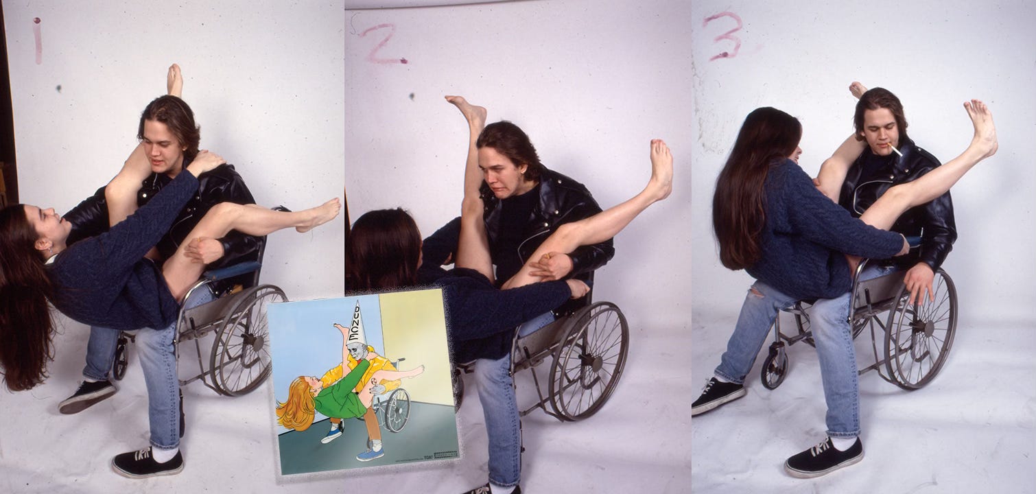 When it came to trivia about The Jesus Lizard in the early 90s, Matt’s bench of incredible humblebrags was deep, but nothing topped the fact that he was one of the models who posed for the “Wheelchair Epidemic” single from ’91. Flash ahead, years later when I’m the editor/design monkey behind “BOOK” and I remembered and asked him to send along which we included in the dang thing. His one-time partner Grace Jeffers is the female model. Thank you, Grace. Thank you, Matthew.